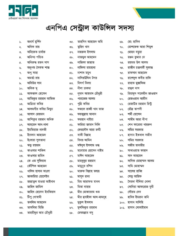 ত্রয়োদশ জাতীয় নির্বাচনের প্রেক্ষাপটে জুলাই গণঅভ্যুত্থানে অংশ নেওয়া বাম ও মধ্যপন্থী মতাদর্শের তরুণদের উদ্যোগে নতুন রাজনৈতিক প্ল্যাটফর্ম ‘নেটওয়ার্ক ফর পিপলস অ্যাকশন (এনপিএ)’ আত্মপ্রকাশ করেছে। শুক্রবার বিকেলে রাজধানীর কেন্দ্রীয় শহীদ মিনারে আয়োজিত অনুষ্ঠানে প্ল্যাটফর্মটির আনুষ্ঠানিক ঘোষণা দেওয়া হয়। এতে এনপিএর তিনজন মুখপাত্র এবং ১০১ সদস্যের কেন্দ্রীয় কাউন্সিলের নাম ঘোষণা করা হয়। মুখপাত্র হিসেবে দায়িত্ব পেয়েছেন লেখক ও অ্যাক্টিভিস্ট ফেরদৌস আরা রুমী, মঈনুল ইসলাম তুহিন (তুহিন খান) এবং বৈষম্যবিরোধী ছাত্র আন্দোলনের সাবেক সমন্বয়ক ও ছাত্র ইউনিয়নের নেত্রী নাজিফা জান্নাত। কাউন্সিল সদস্য মীর হুযাইফা আল মামদূহ মঞ্চ থেকে কেন্দ্রীয় কাউন্সিলের নাম ঘোষণা করেন। কেন্দ্রীয় কাউন্সিলের মধ্যে জাতীয় নাগরিক পার্টি (এনসিপি) থেকে পদত্যাগ করা চার নেতাও রয়েছেন। তারা হলেন সাবেক যুগ্ম আহ্বায়ক অনিক রায়, সাবেক যুগ্ম সদস্যসচিব তুহিন খান, সাবেক কালচারাল সেলের উপপ্রধান সৈয়দা নীলিমা দোলা এবং সাবেক সদস্য সৈয়দ ইমতিয়াজ নদভী। এছাড়া কাউন্সিলে রয়েছেন বেসরকারি বিশ্ববিদ্যালয়ের শিক্ষক অলিউর সান, ছাত্র ইউনিয়নের সাবেক সভাপতি বাকী বিল্লাহ, ঢাকা বিশ্ববিদ্যালয় শাখার বর্তমান সভাপতি মেঘমল্লার বসু, সাধারণ সম্পাদক মাঈন আহমেদ, বৈষম্যবিরোধী ছাত্র আন্দোলনের সাবেক সহসমন্বয়ক নূমান আহমাদ চৌধুরী, রাফসান আহমেদ এবং বিভিন্ন রাজনৈতিক ও সামাজিক আন্দোলনের নেতারা। নাম ঘোষণার পর এনপিএর তিন মুখপাত্র প্ল্যাটফর্মের ঘোষণাপত্র পাঠ করেন। এ সময় পাঁচটি মূলনীতি ঘোষণা করা হয়—গণতন্ত্র, সাম্য, মানবিক মর্যাদা, সামাজিক ন্যায়বিচার এবং প্রাণ, প্রকৃতি ও পরিবেশ সুরক্ষা। ঘোষণাপত্রে বলা হয়, জুলাই গণঅভ্যুত্থান বাংলাদেশের রাষ্ট্র ও নাগরিকের সম্পর্কের মৌলিক প্রশ্ন সামনে এনেছে। এটি শুধুমাত্র শাসক পরিবর্তনের দাবি নয়, বরং ফ্যাসিবাদী রাষ্ট্রকাঠামো ভেঙে প্রকৃত গণতান্ত্রিক ব্যবস্থা প্রতিষ্ঠার আকাঙ্ক্ষার প্রকাশ। তবে দেড় বছর পর অন্তর্বর্তী সরকারের বিভিন্ন উদ্যোগ সত্ত্বেও বাস্তবতা হতাশাজনক হয়ে উঠেছে এবং অন্তর্ভুক্তিমূলক রাজনৈতিক পরিসরের স্বপ্ন অনেকটাই ভেঙে পড়েছে। এছাড়া ঘোষণাপত্রে বলা হয়, বর্তমানে পুরোনো রাজনৈতিক বন্দোবস্তের ভাষা ও চর্চা পুনরুত্থান পাচ্ছে। সিদ্ধান্ত গ্রহণে সংখ্যালঘুদের কণ্ঠস্বর উপেক্ষিত হচ্ছে।