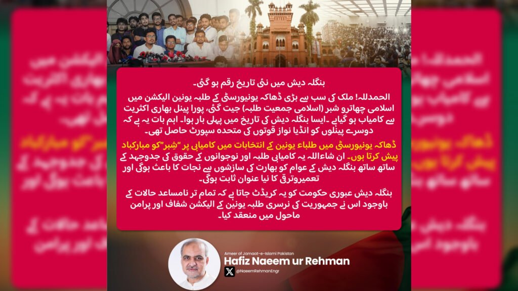 পোস্টে পাকিস্তান জামায়াতে ইসলামী বলেছে, “বাংলাদেশে নতুন ইতিহাস রচিত হলো। আলহামদুলিল্লাহ! দেশের সবচেয়ে বড় বিশ্ববিদ্যালয়ের ছাত্র সংসদ নির্বাচনে ইসলামী ছাত্রশিবির পূর্ণ প্যানেলে বিপুল ব্যবধানে জয়লাভ করেছে। বাংলাদেশের ইতিহাসে এটা প্রথমবার ঘটল।”