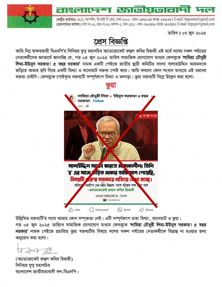 বিজ্ঞপ্তিতে অ্যাডভোকেট রুহুল কবির রিজভী জানান, গত ৫ জুন ২০২৫ তারিখে ‘লামিয়া চৌধুরী লিমা-ইউনুস সরকার! ৫ বছর দরকার’ নামক একটি ফেসবুক পেইজে তার ছবি ব্যবহার করে এবং জাতীয় স্থায়ী কমিটির সদস্য সালাহউদ্দিন আহমদকে জড়িয়ে একটি মিথ্যা ও বানোয়াট বক্তব্য পোস্ট করা হয়েছে। তিনি স্পষ্ট করে বলেছেন, “আমি কখনো কোন সংবাদ মাধ্যমে এই ধরনের বক্তব্য দেইনি। ফেসবুকে পোষ্টকৃত বক্তব্যটি সম্পূর্ণরুপে মিথ্যা ও মনগড়া।”